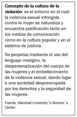 Concepto de la cultura de la violación: es el entorno en el cual la violencia sexual infringida contra la mujer se naturaliza y encuentra justificación tanto en los medios de comunicación como en la cultura popular y en el sistema de justicia.