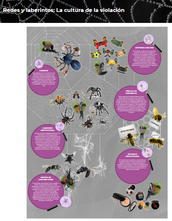 Otro sector involucrado en la cultura de la violación, ejemplificado con la telaraña, es la sociedad y la doctora de las Mercedes hace mucho énfasis en que, “generalmente la sociedad se mantiene como espectadora, no suele salir en defensa de las víctimas y que más bien, todo lo contrario, suele sumarse al linchamiento de las víctimas y se une a cuestionar la verdad de las víctimas”. La sociedad va a contribuir deformando la verdad a través de los estereotipos sobre la violencia contra las mujeres. Rara vez las mujeres encontrarán la sororidad y esta es la gran ausente.